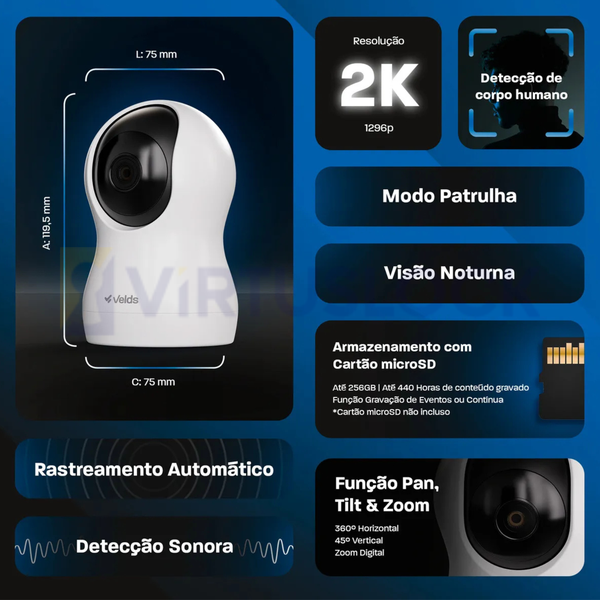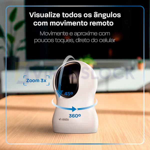 • Monitoramento Panorâmico com Zoom Digital: Controle a câmera pelo app Velds e acompanhe todos os cantos do ambiente com rotação horizontal de 360° (Pan), vertical (Tilt) e zoom digital de até 3x.