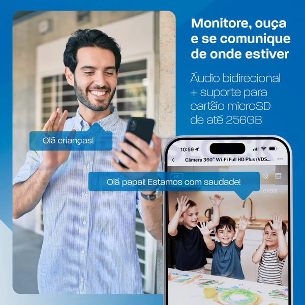 O áudio bidirecional permite comunicação em tempo real com o ambiente monitorado, e o armazenamento local garante segurança dos registros, com suporte para cartão microSD de até 256GB.