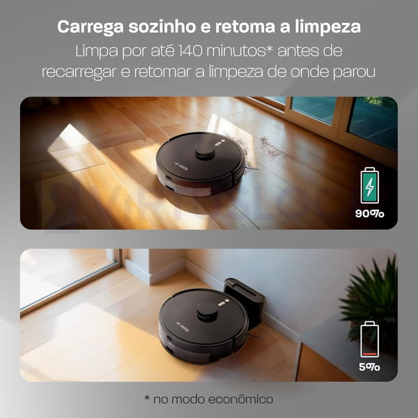 Dispõe de recarga automática, retornando à base sempre que a bateria estiver baixa, e funcionamento bivolt, adaptando-se a diferentes instalações elétricas. Seu design moderno na cor preta combina facilmente com qualquer ambiente.
