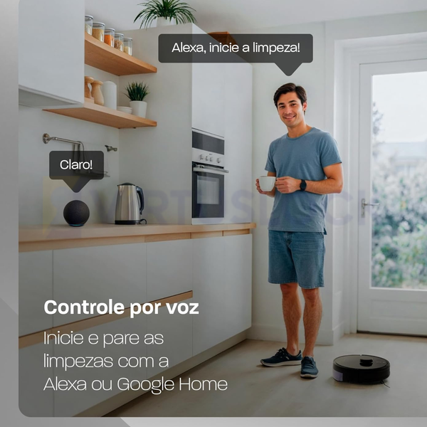 O controle pode ser feito diretamente pelo aplicativo, onde é possível agendar limpezas, selecionar modos de funcionamento e acompanhar o desempenho do robô. É compatível com Alexa e Google Assistente, permitindo acionamento por comando de voz.